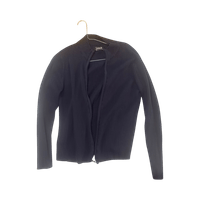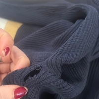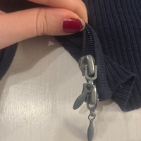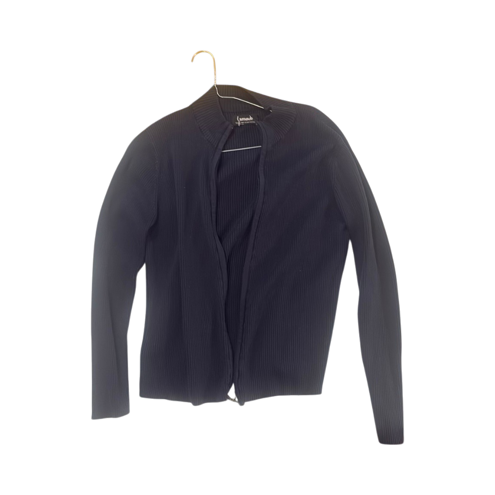 Navy ribbed zip-up cardigan with armpit tear.