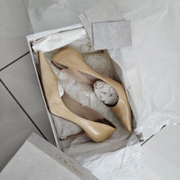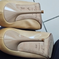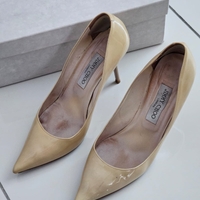 Jimmy Choo Agnes 85 kengät nudea kiiltonahkaa, koko 38,5. Käytetyt, käytön jälkiä näkyy sisä- ja ulkopohjissa. Toisessa kengässä pieni värjäymä (pilkku). Kantapäissä tarrapehmusteet mitkä saanee suutari pois, ei yritetty poistaa. Koroissa muutama pieni nirhauma. Kaikki tämä otettu hinnassa huomioon. Alkuperäinen hinta n 450 e.