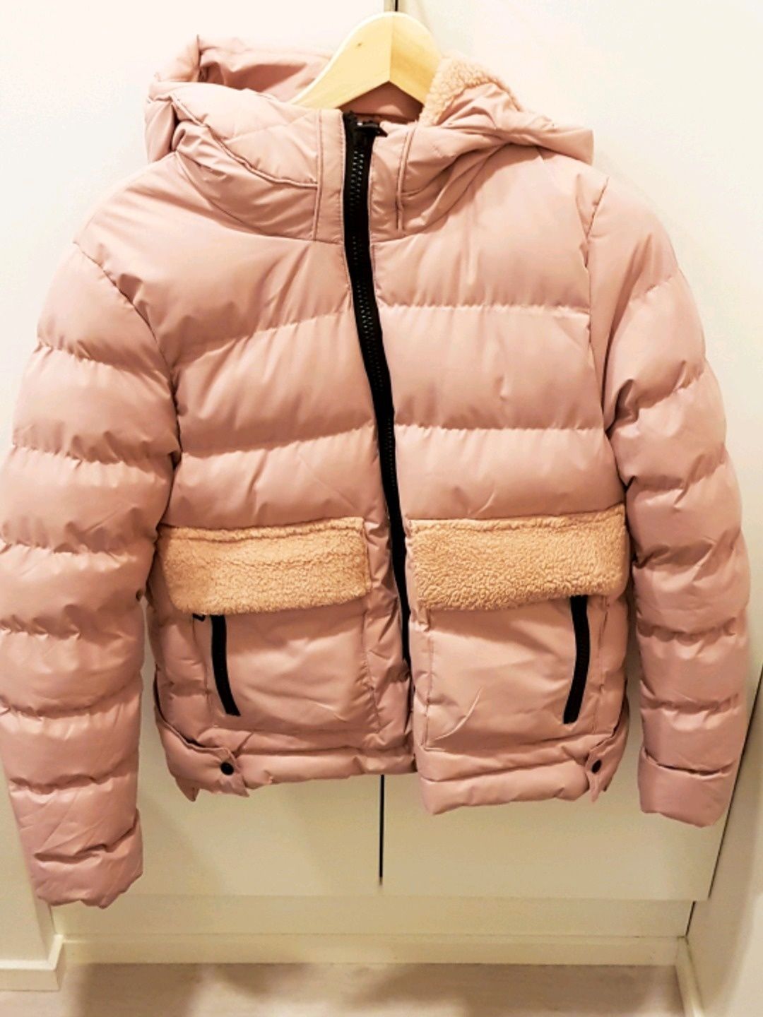 Puffer- tyylinen, viime keväänä ostettu ja pidetty muutamia kertoja. Lämmin takki ja hyvässä kunnossa. Kuva otettu sisällä, joten vääristää väriä. Oikeasti "puhtaampi" vaaleanpunainen väri
