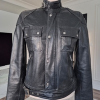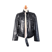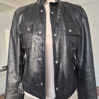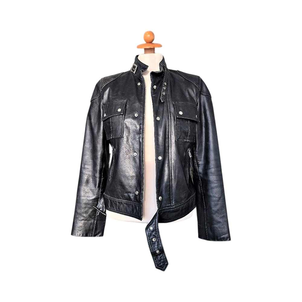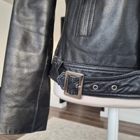 Genuine leather Andiata jacket, size 38. Classic black biker style with buckle collar, snap-button front, zip pockets, and adjustable waist belt. Soft leather with light wear on the shoulder but overall in very good condition. A timeless and versatile piece.