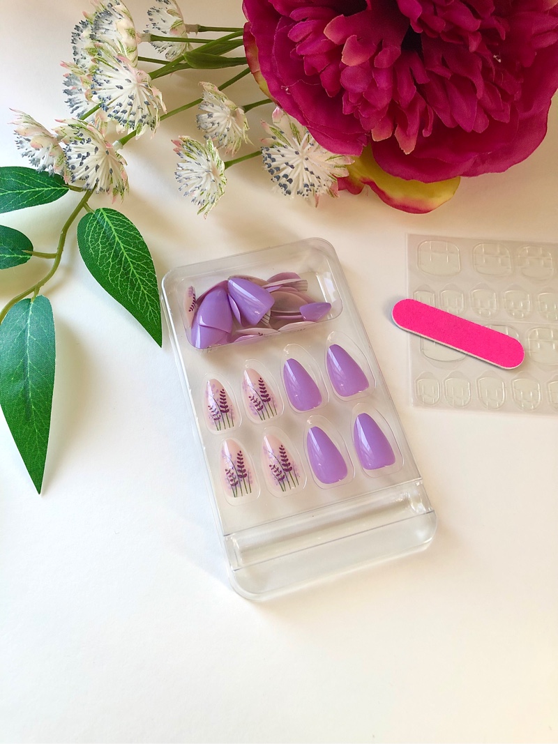 Laatikko sisältää 24 eri kokoista kynttä, liimatarrat ja kynsiviilan.
