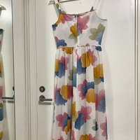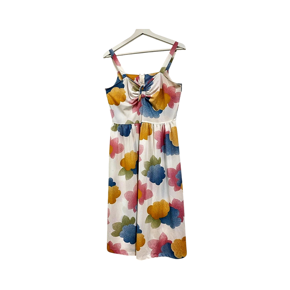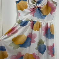 Ihana vintage kirjava kukkamekko, valmistettu Suomessa. Koko on noin S-M. Kainalo-kainalo 41cm, pituus 110cm.