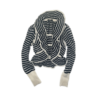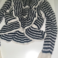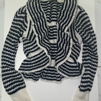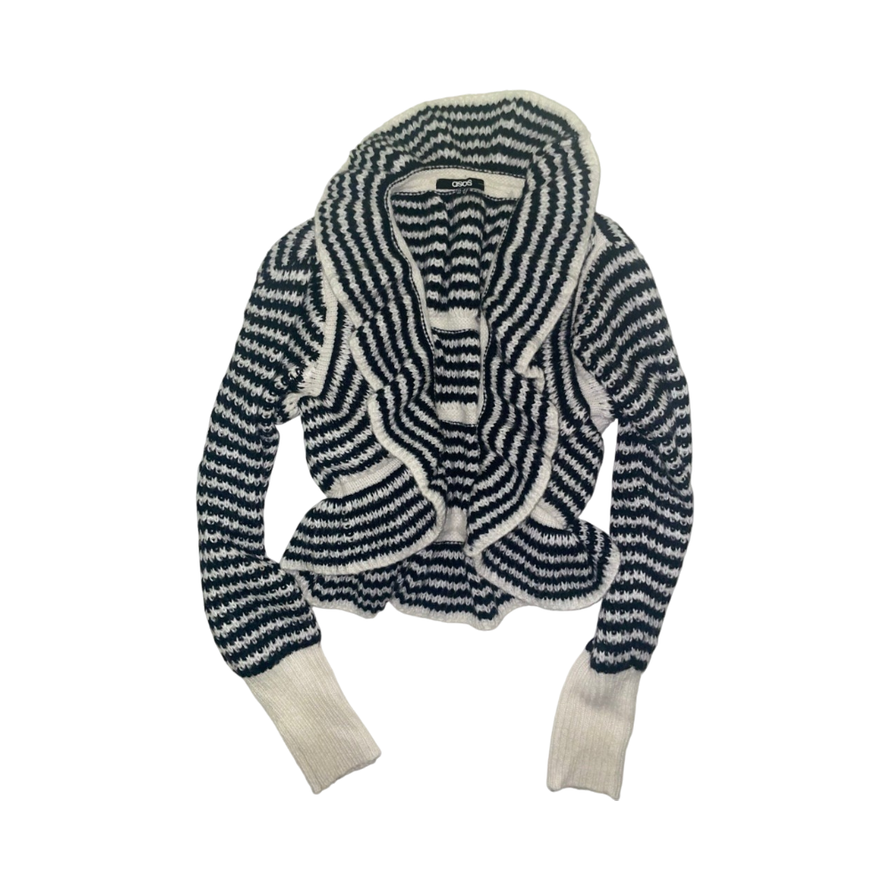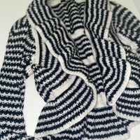 Mustavalkoinen raidallinen neuletakki, röyhelöreunuksin.