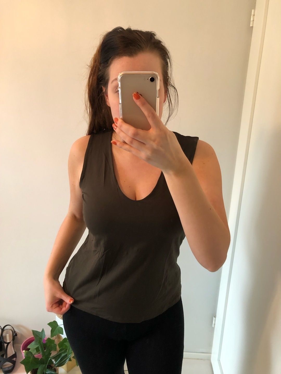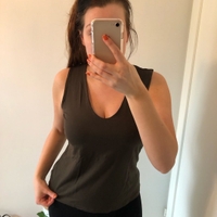 Uusi tumman vihreä toppi, jossa hintalappu vielä kiinni. Laadukkaan oloinen, mukavaa ”liukasta” kangasta, hyvin venyvä ja istuva. Kokolapussa lukee 42 mutta mielestäni enemmän 40 kokoa, koska on vähän lyhyempää mallia.