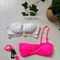 2 x offshoulder bandeau, neon pinkissä hintalappu vielä kiinni, irroitettavat olkaimet ja paketissa pidempi olkain mukana, jotta voi käyttää halterneckinä. Valkoiset vähän käytetyt siistissä kunnossa, puuvillaa sisältä. Molemmissa crop topeissa irroitettavat toppaukset. Valkoisista kokolappu leikattu pois ja pinkeissä lukee M, ovat saman kokoisia. Mielestäni kyllä S kokoa max B kuppi.