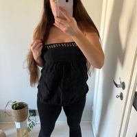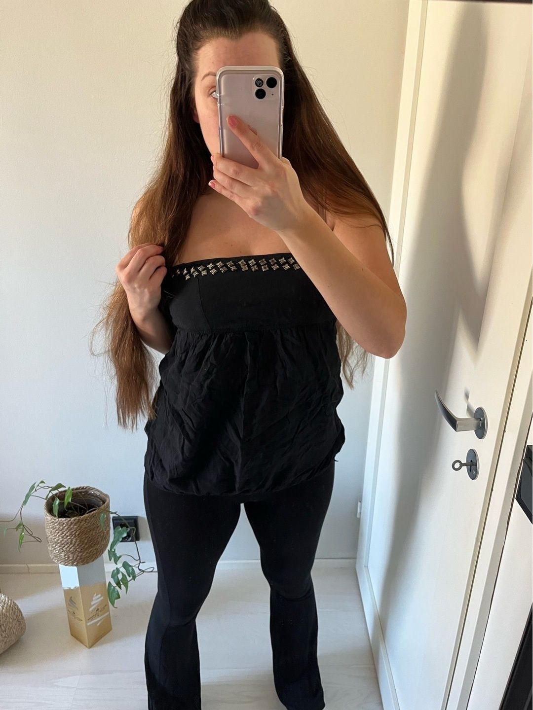 Musta tuubi toppi jossa alhaalla resori jonka voi myös nostaa ylemmäs. Niittejä yläreunassa, jotka vähän purkautuneet ja tippuneet toiselta puolelta. Muuten hyvässä kunnossa, pehmeä materiaali, kokolapussa lukee L/XL mutta mielestäni vastaa kokoa pieni M 🤗