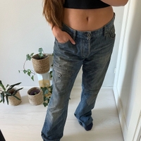 Low waist bootcut boyfriend malliset farkut etureisi taskulla. Mielestäni vastaa kokoa M. Kokolapussa lukee 36-34. Lahkeet vähän hajonneet, koska olleet käännettynä, toisessa isompi reikä. Muuten siistissä kunnossa.
