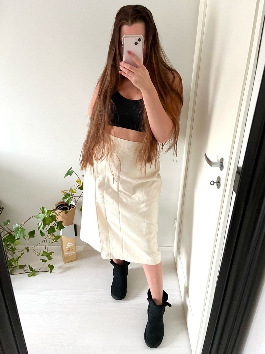Valkoinen vintage hame todennäköisesti villaa ainakin osin, ei lappuja. Uusi käyttämätön, hintalappu kiinni. Edessä käänne yksityiskohtana ja joka muuttuu halkioksi lopun 20 cm. Mielestäni koko on XL, vyötärö 91 cm, kangas tukeva eikä jousta.