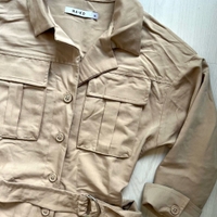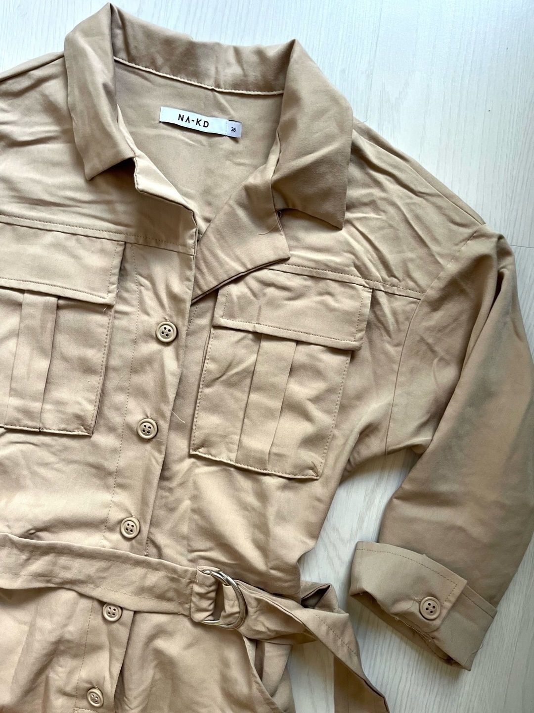Uusi käyttämätön beige NA-KD cargo haalari capri pituisilla housuilla ja lyhyillä hihoilla. Vyö tulee mukana ja edessä taskut. Koko 36 mielestäni vastaa kokoa XS tai pieni S. Kangas ei jousta, kaikai mitta 50 cm.