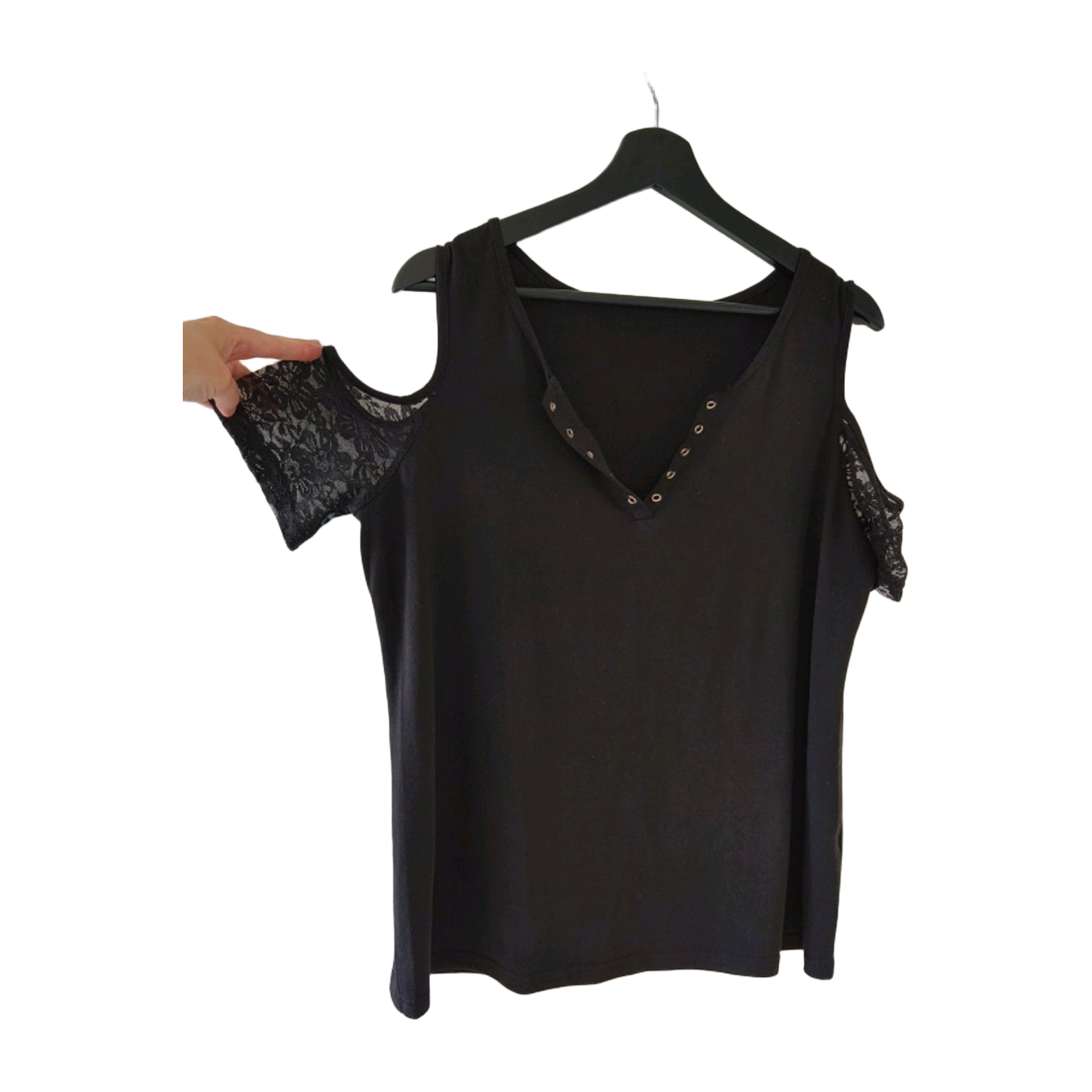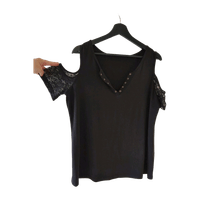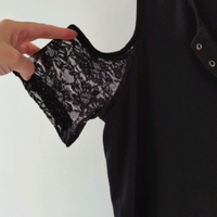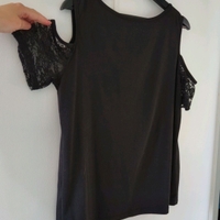 Musta lyhythihainen paita pitsillä ja nyöripaikoilla. Ostettu vuosi sitten, mutta käytetty vain muutaman kerran. Koko L.