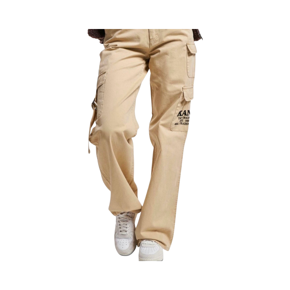 Beiget leveälahkeiset cargo-housut, taskuilla ja printillä. Karl kani merkkiset housut. Käyttämättömät!