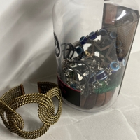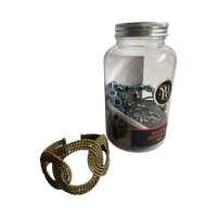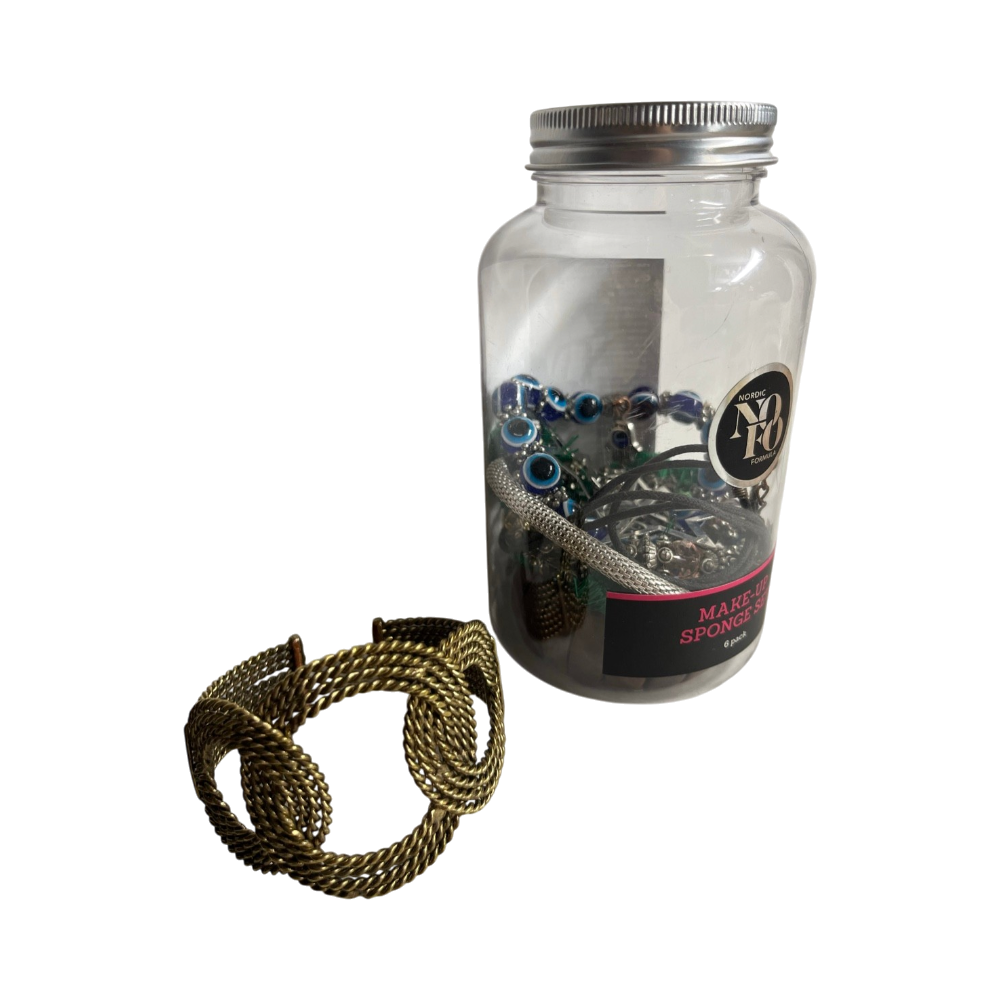 Mysteeri korusetti, jossa tulee 5 kpl käsikoruja, kaulakoru ja 2 kpl korviksia. Yksi käsikoruista ei mahtunut purkkiin, mutta tulee purkin mukana myös.