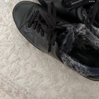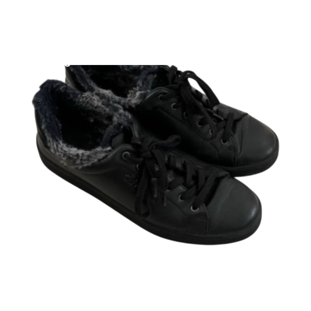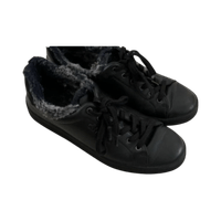 Black low-top sneakers with fuzzy faux-fur lining, lace-up closure.