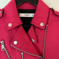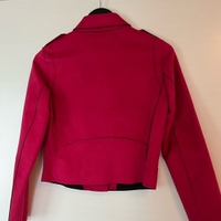 Tekomokkainen bikertakki. Vadelmanpunainen, ei ihan niin kirkas mitä kuvissa.