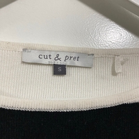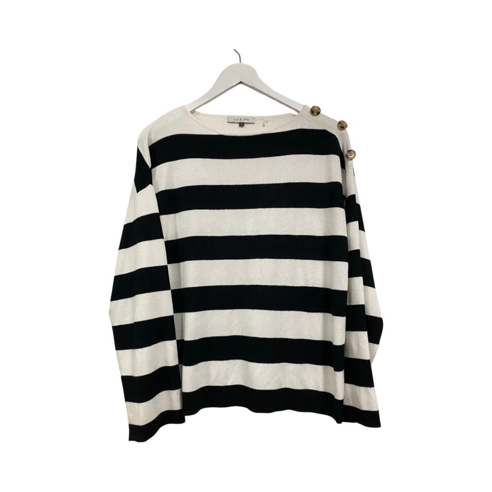 Klassikko mustavalkoinen pitkähihainen neulepusero/neulepaita, Stockmannin merkki Cut & Pret. Materiaalilappu ei löytyy, mutta kangas on tosi pehmeä, ihan joustava ja mukava.