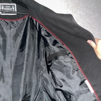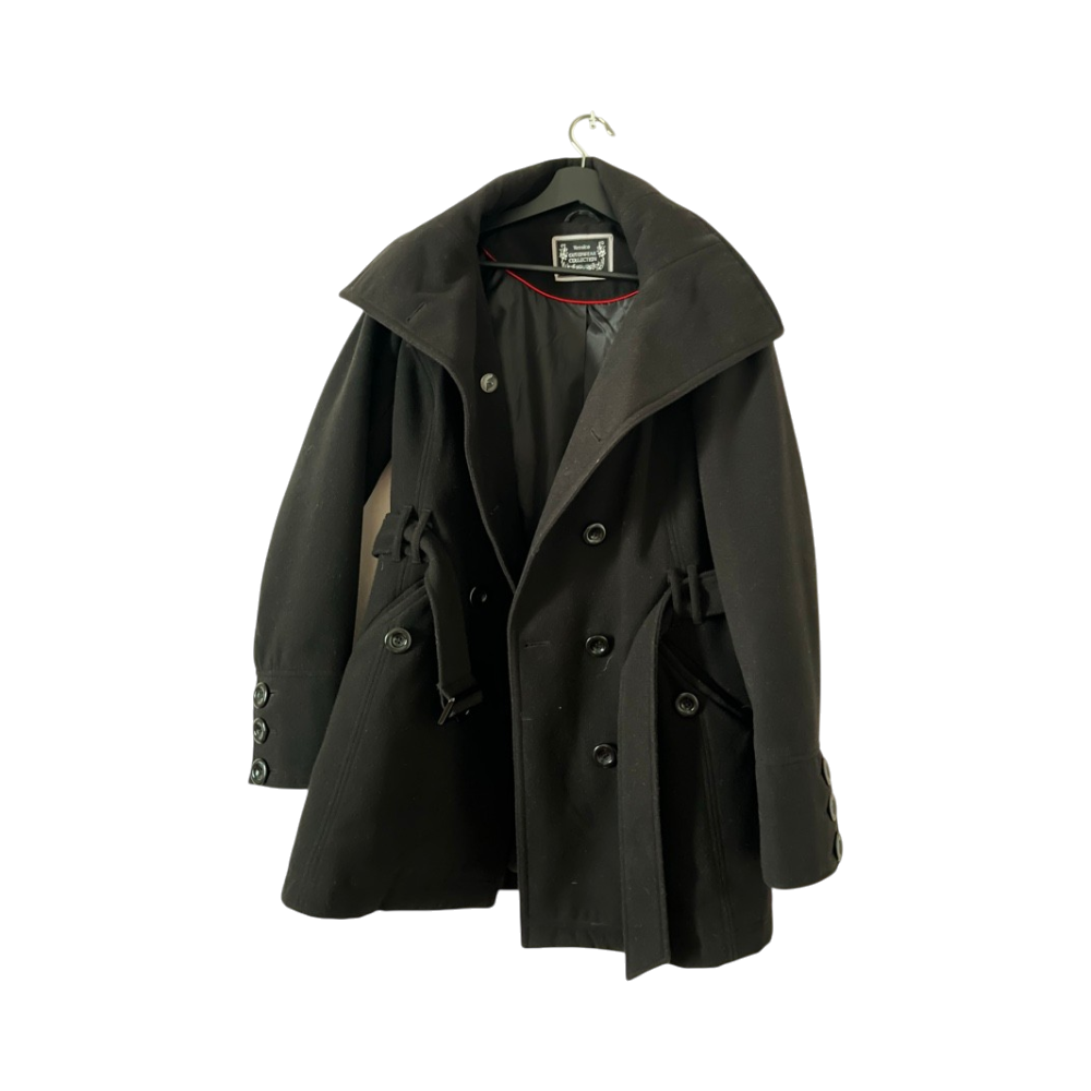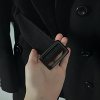 Musta trenssitakki vyöllä ja napituksella, itselle liian pieni