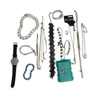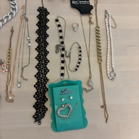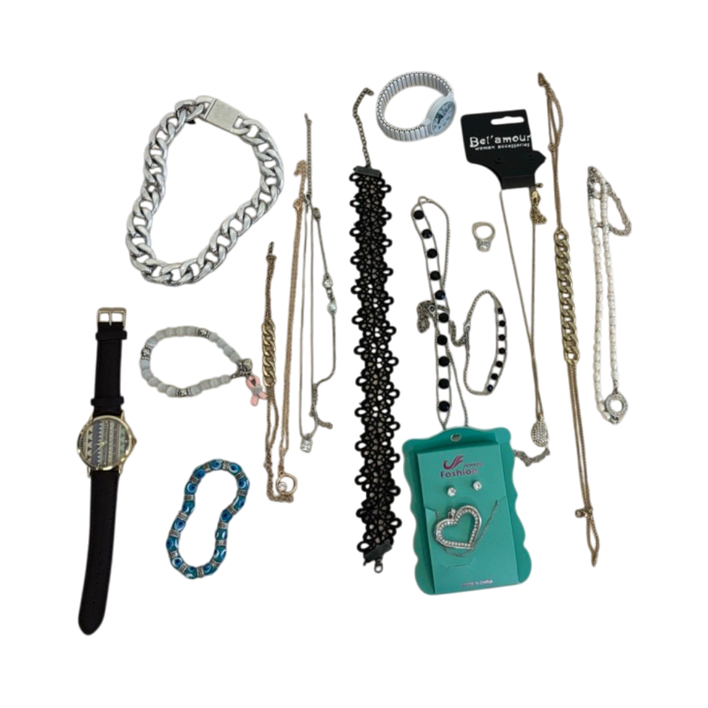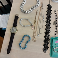 Sekalainen kokoelma kaulakoruja, rannekoruja ja kelloja.