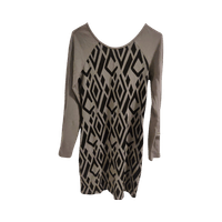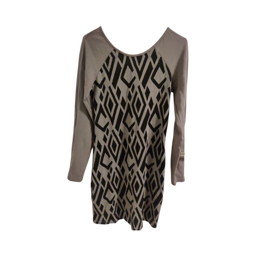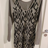 Pitkähihainen musta-harmaa kuvioitu mekko. Laput leikattu irti, selästä avoin. Hyvä käytetty kunto. Mahdollisesti Vila- merkkinen.