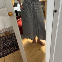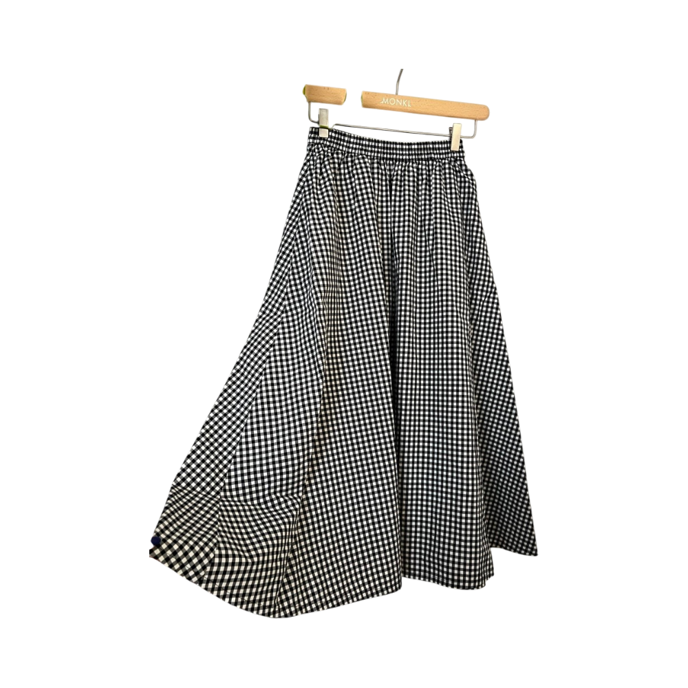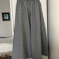 Musta-valkoinen gingham-midihame, kuminauhavyötärö, 100% puuvilla, taskuilla.