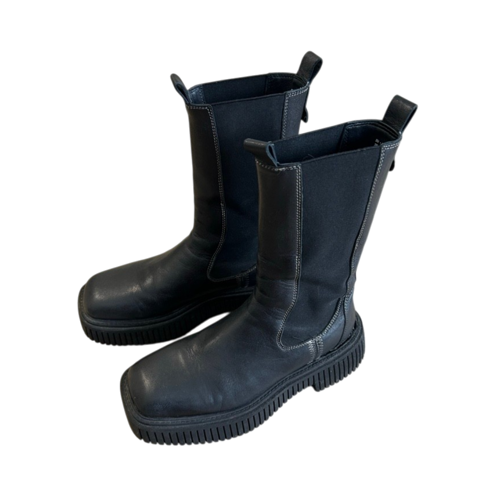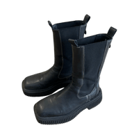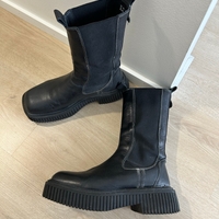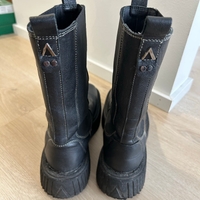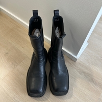Mustat saappaat aitoa nahkaa, erinomainen kunto, neliömäinen kärki eli sopii leveämmällekin jalalle, platform pohja