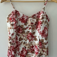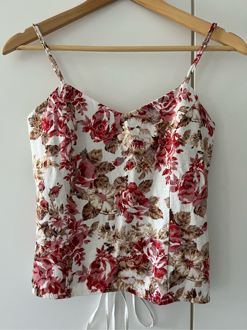 Tazzian korsettitoppi punaisilla ja ruskeilla kukilla. Selässä tosiaan nyöritys mutta sivulla myös piilovetoketju. Ei materiaali tai kokolappua. Menee suunnilleen S-M kokoiselle parhaiten. Erittäin siistissä kunnossa. Ainut huomio että sisäpuolelta kangas on pikkaisen nyppyyntynyt helmasta. Made in Finland