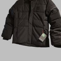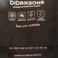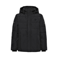 Padded black jacket with a hood. Features include windproof and water-repellent materials. Size EU 160 / UK 12-14Y / US 14-16.