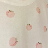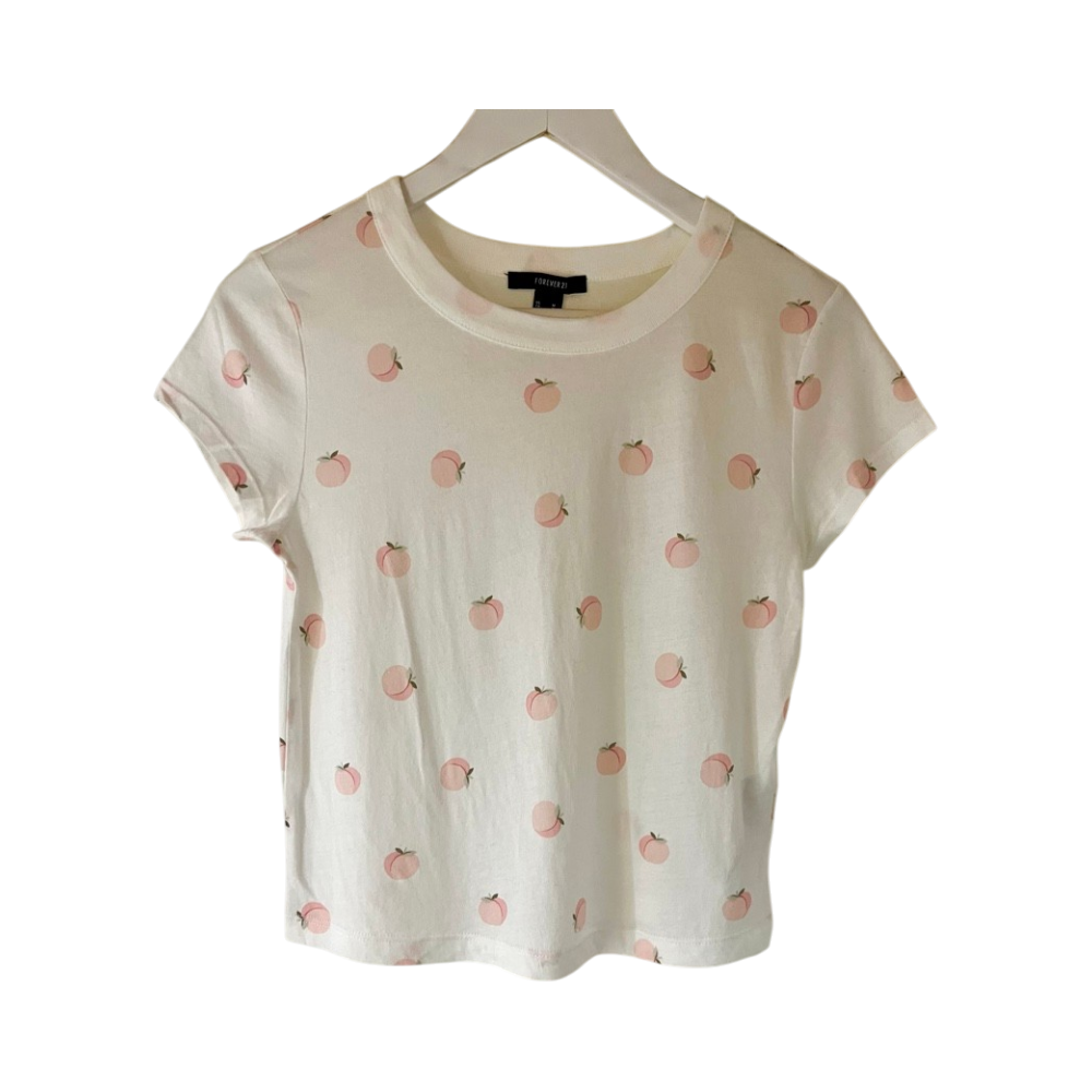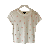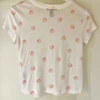 Lyhyt valkoinen t-paita ohuesta kankaasta, vaalein persikkaprinttein. Käyttämätön.