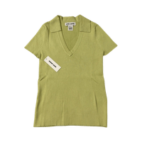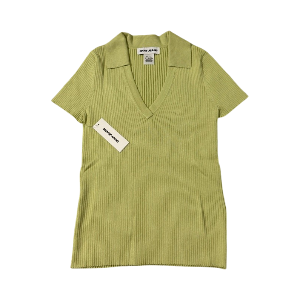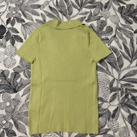 Lightweight short-sleeve ribbed v-neck top, collared neckline.