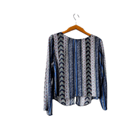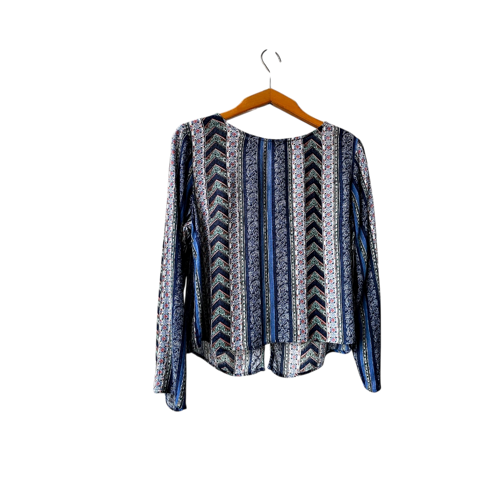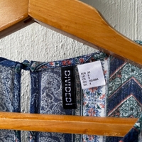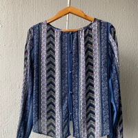 Kevyt pitkähihainen paita, jossa napitettava avonainen selkäpuoli. Koko 38, kainalo-kainalo 55 cm ja pituus 56 cm. Malli väljähkö, materiaali viskoosia.