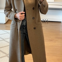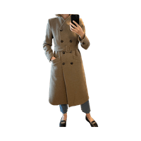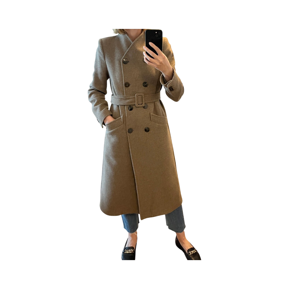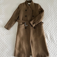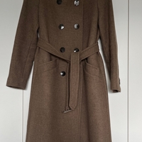 Pitkä villakangastakki vyöllä, siisti käytetty kunto. 67% villa