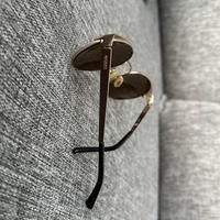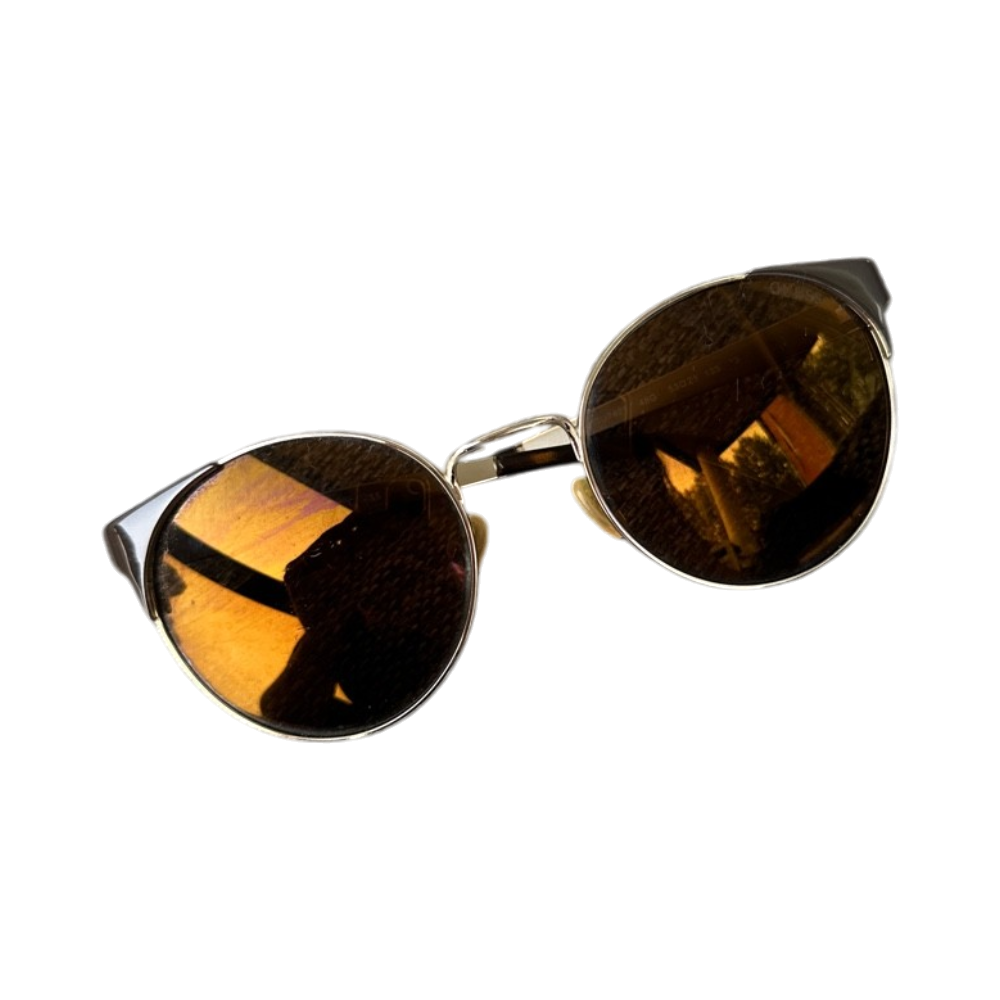 Round-frame sunglasses with brown mirrored lenses, gold metal bridge.