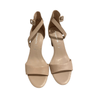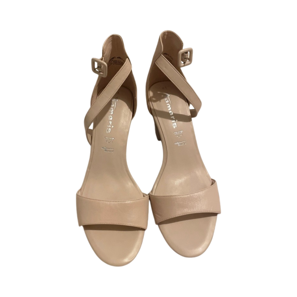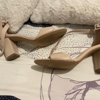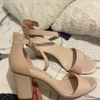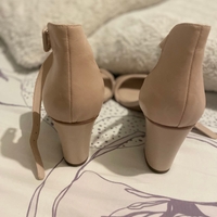 Nude ankle-strap block heels, elegant and unused.