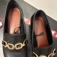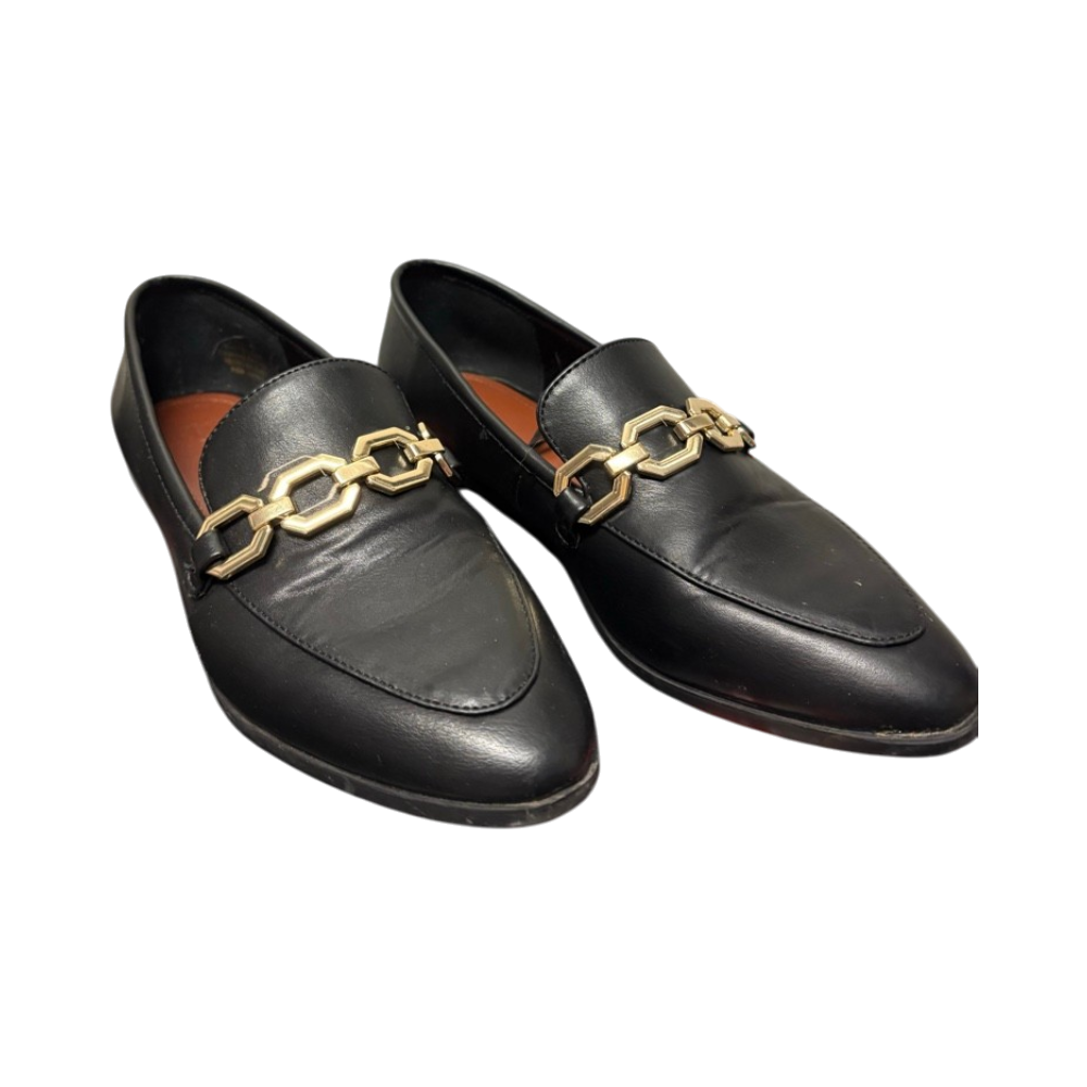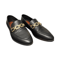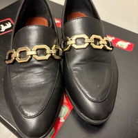 Mustat loafersit kullanvärisellä ketjuyksityiskohdalla. En ole varma onko aitoa vai keinonahkaa.
