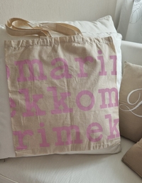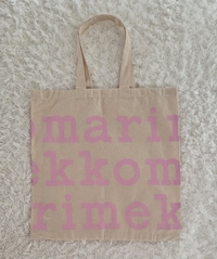 Marimekko käyttämätön kangaskassi vaaleanpunainen teksti. Materiaali ekopuuvilla.