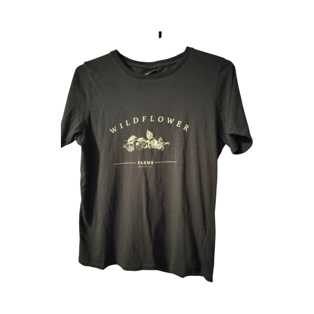Tumman harmaa painokuvioinen t-paita, lyhythihainen casual-tyyli.