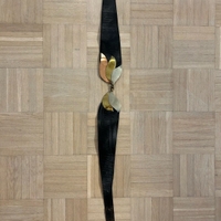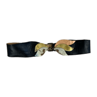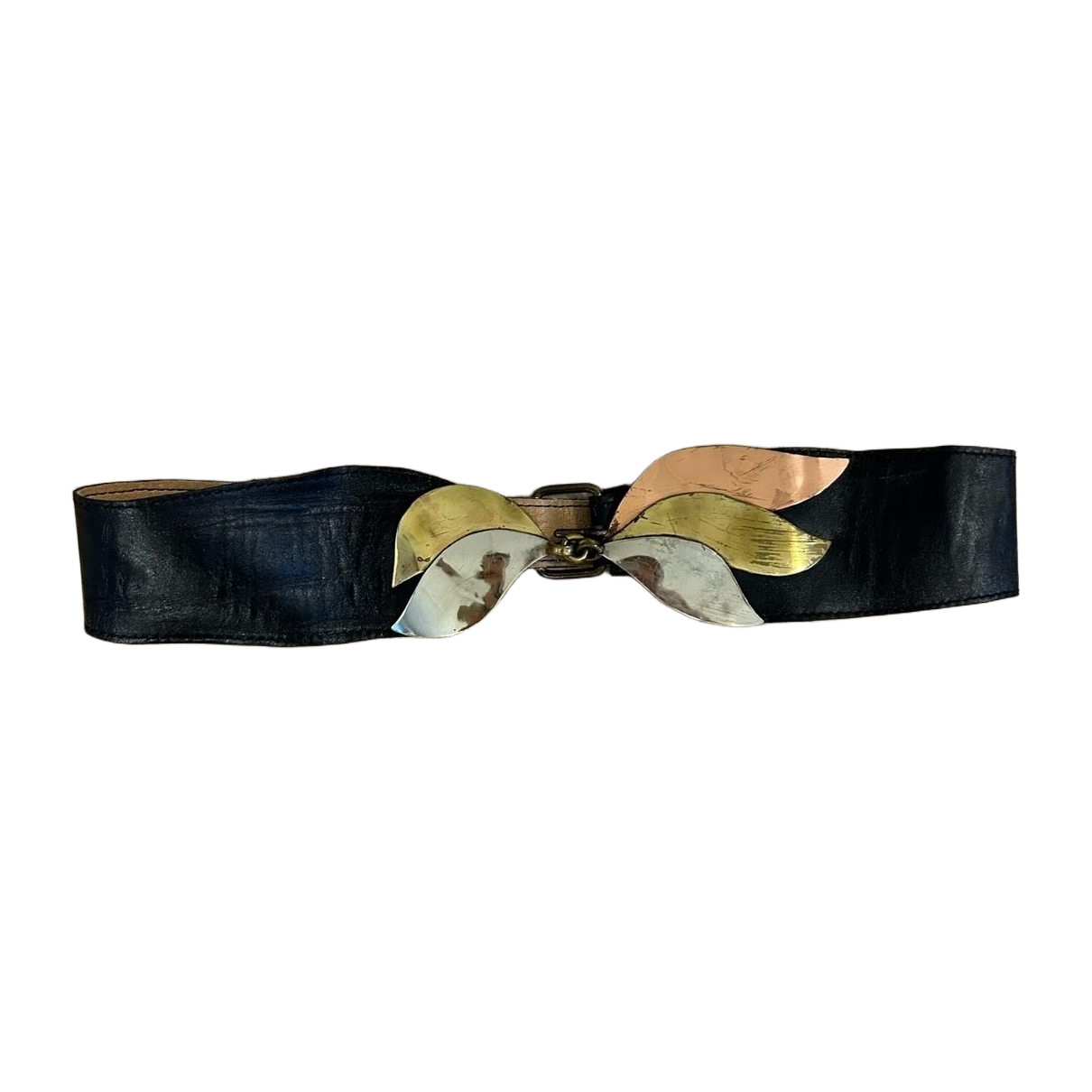 Musta vintage nahkavyö kauniilla metallisella koristeella. Metallissa väreinä hopea, kulta, pronssi.