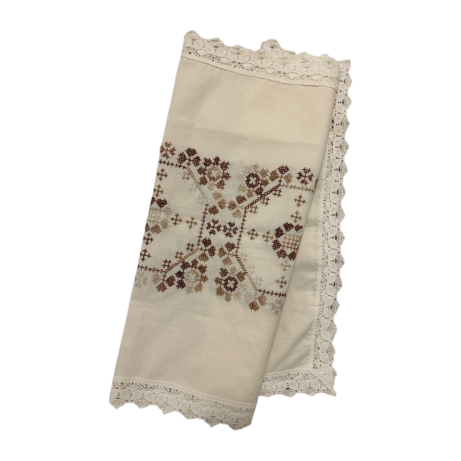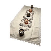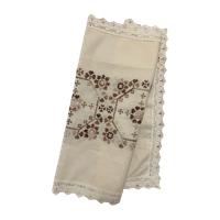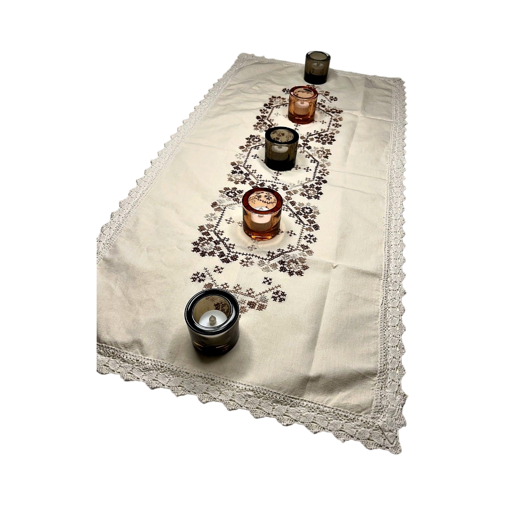 Luonnonvalkoinen kaitaliina jossa käsintehty kukkakuviointi beige ruskea. Pitsireunat. Kauniit värit. Sopii monenlaiseen sisustukseen.