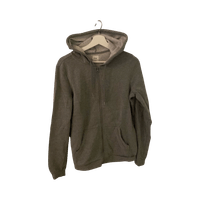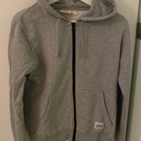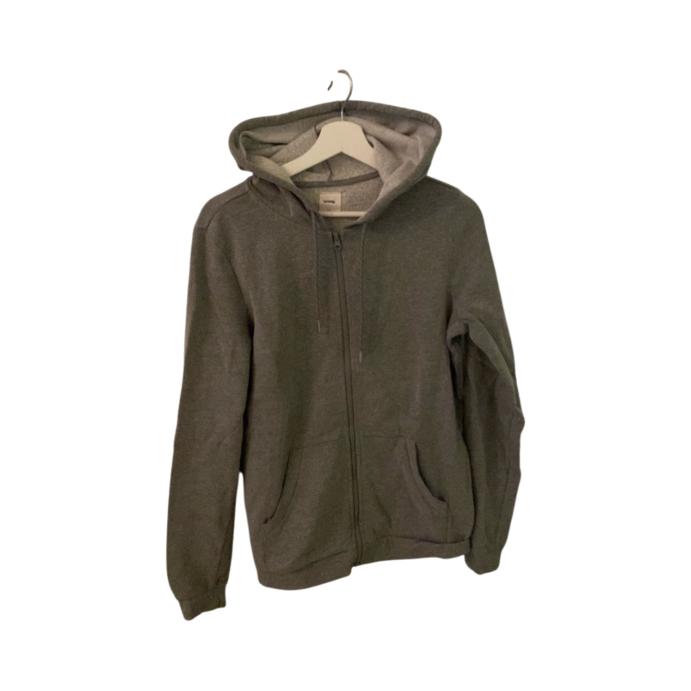 Yksinkertainen harmaa vetoketjullinen hupullinen collegetakki.
