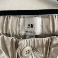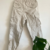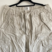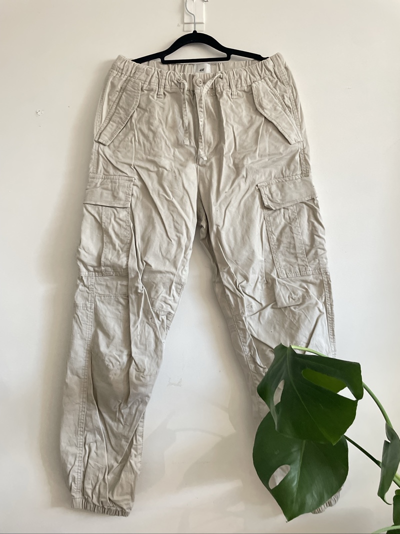 Beiget miesten cargo-housut, kapeat resorit lahkeissa.