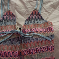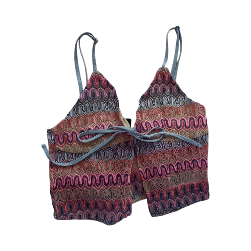Värikäs ribbineulottu toppi, säädettävät olkaimet ja nauha edessä.