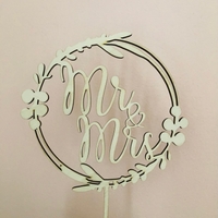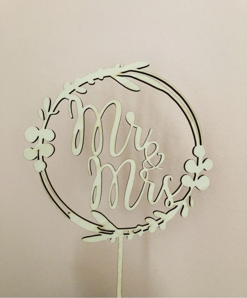 Puinen kakkukoriste häihin, ympyrä ja teksti 'Mr & Mrs'.