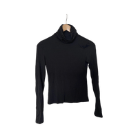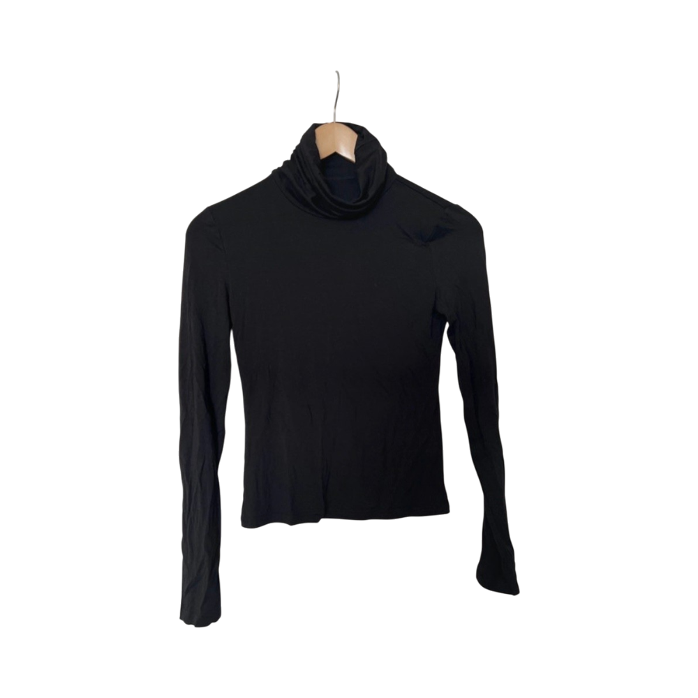 Slim long-sleeve black turtleneck, stretchy lightweight knit.