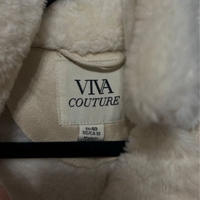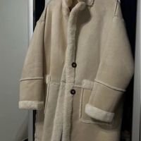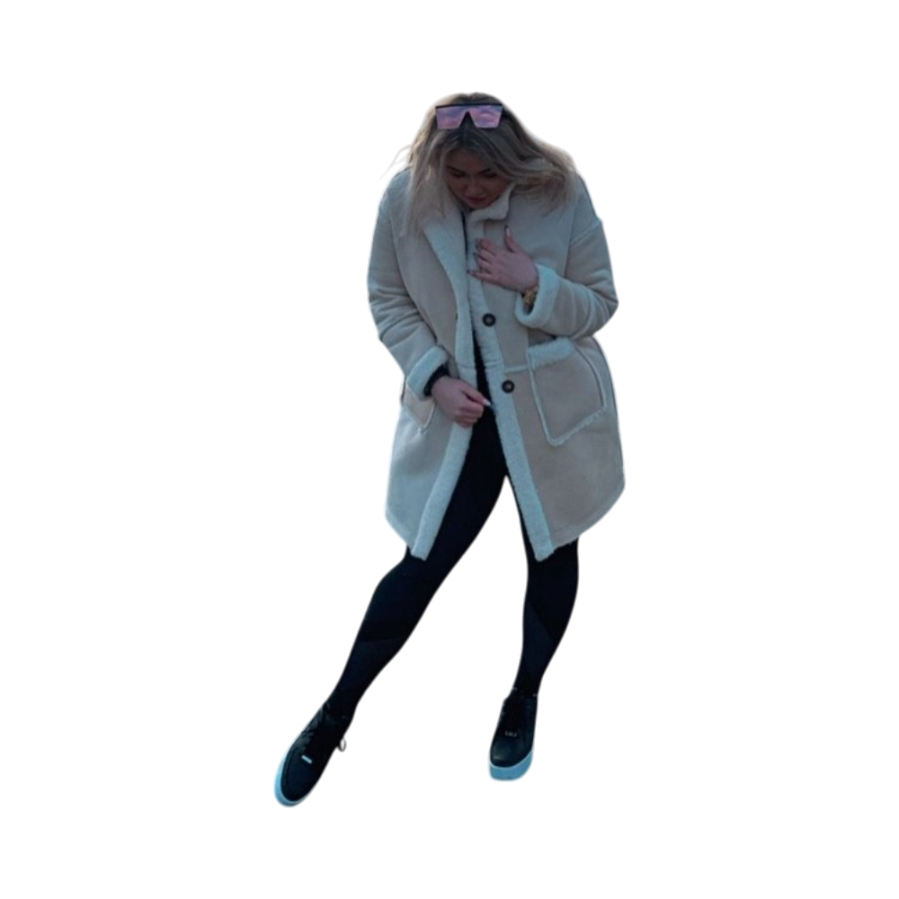 Cream shearling-style teddy coat, warm and oversized, button front.