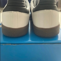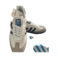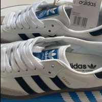 White leather sneakers with navy stripes, suede toe and gum sole.