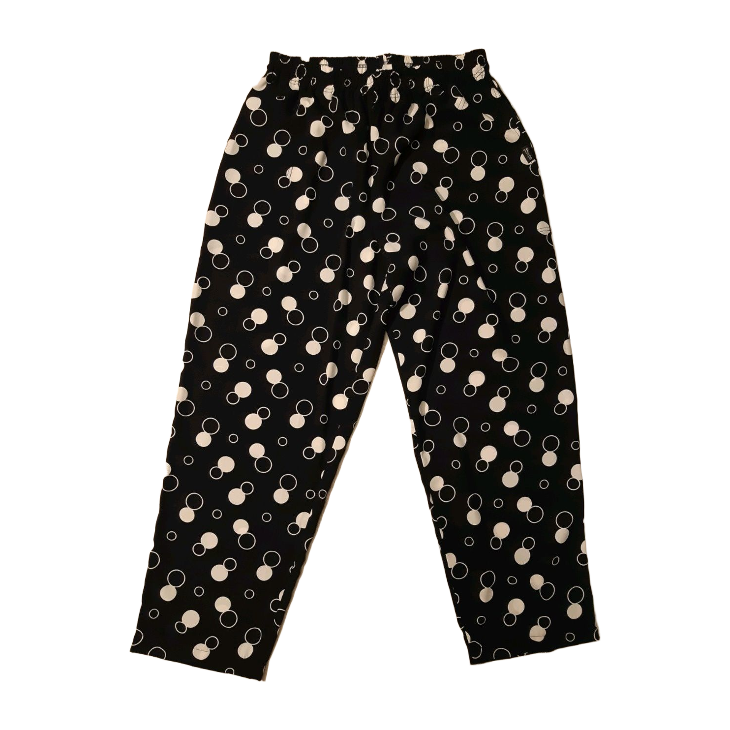Ohuet tummansiniset housut, joissa valkoisia pallokuvioita. Sivuilla taskut. Vintagea, lapussa lukee Sirpan Kotikutomo ja Suomenlippu. Koko 38-40. Housut sopii noin 160cm pituiselle.