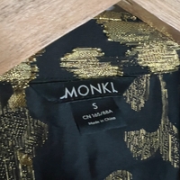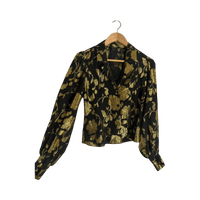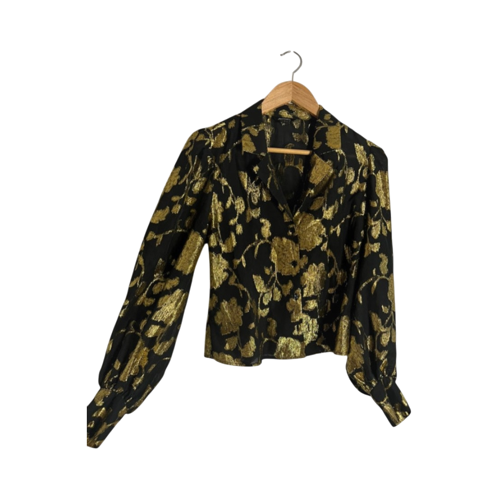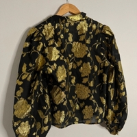 Kultaiset kukkakuvioinnit, pusero juhlavaan käyttöön. Edessä napit. Läpikuultava kangas.