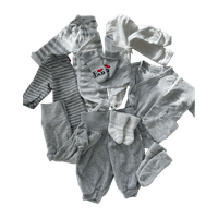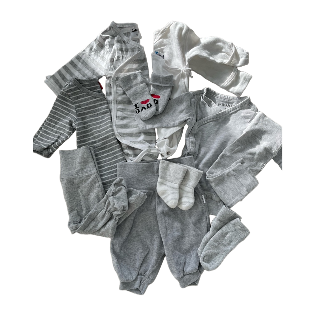 Harmaansävyissä vaatepaketti vauvalle. Koot 50-56. Pääosin siistejä vaatteita. Valkoisessa kietaisubodyssä käännettävät hihansuut, ja pientä pesuhaitua pinnassa. Sukissa ei nyppyä, enkä muistakaan vaatteista löydä mitään sanomista. En kuitenkaan syynää jokaista saumaa myöten. Tästä ihana vaatepaketti seuraavalle pienelle🤍