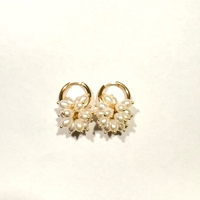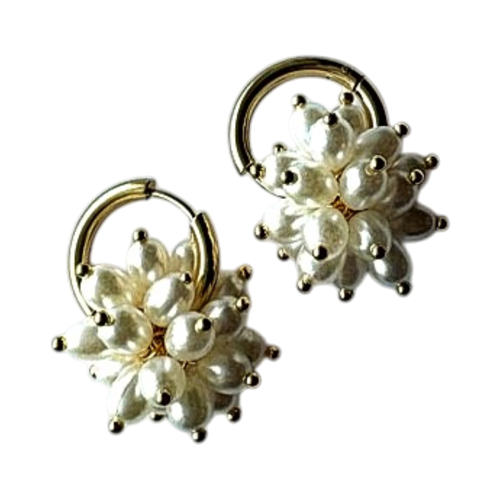 Valkoiset helmikorvikset/ rypälekorvikset kullanvärisillä yksityiskohdila. Renkaat ovat ruostumatonta terästä ja 18K kultauksella päällystetyt.