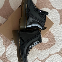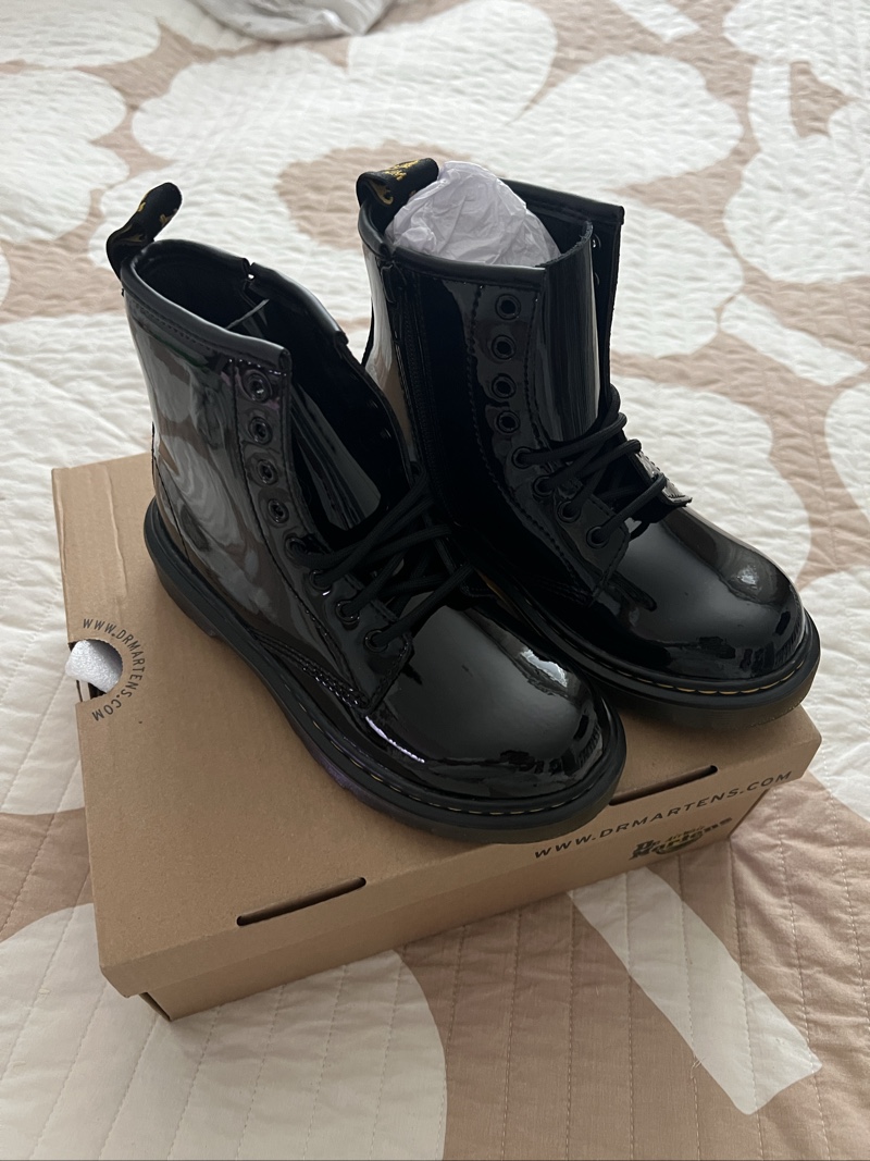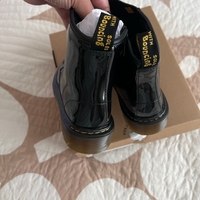 Dr martens Black patent leather zipper ankle boots with yellow welt stitching.