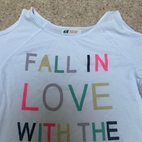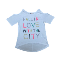 Tyttöjen lyhyt hihainen paita jossa avoin olkapää.
